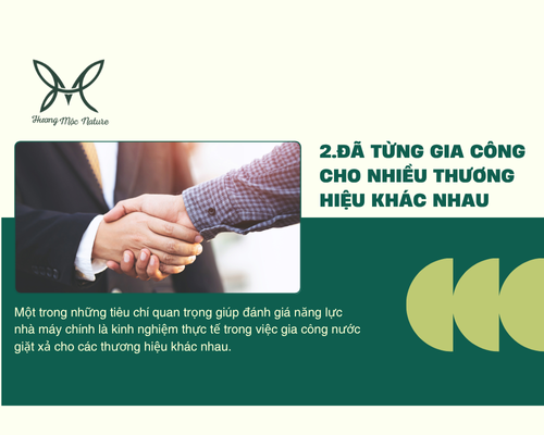 Một trong những tiêu chí quan trọng giúp đánh giá năng lực nhà máy chính là kinh nghiệm thực tế trong việc gia công nước giặt xả cho các thương hiệu khác nhau. Kinh nghiệm lâu năm đồng nghĩa với việc nhà máy đã thử nghiệm nhiều công thức, hiểu rõ hành vi người dùng, nắm bắt xu hướng hương liệu, nắm rõ các yếu tố quan trọng để tạo nên sản phẩm phù hợp thị hiếu.