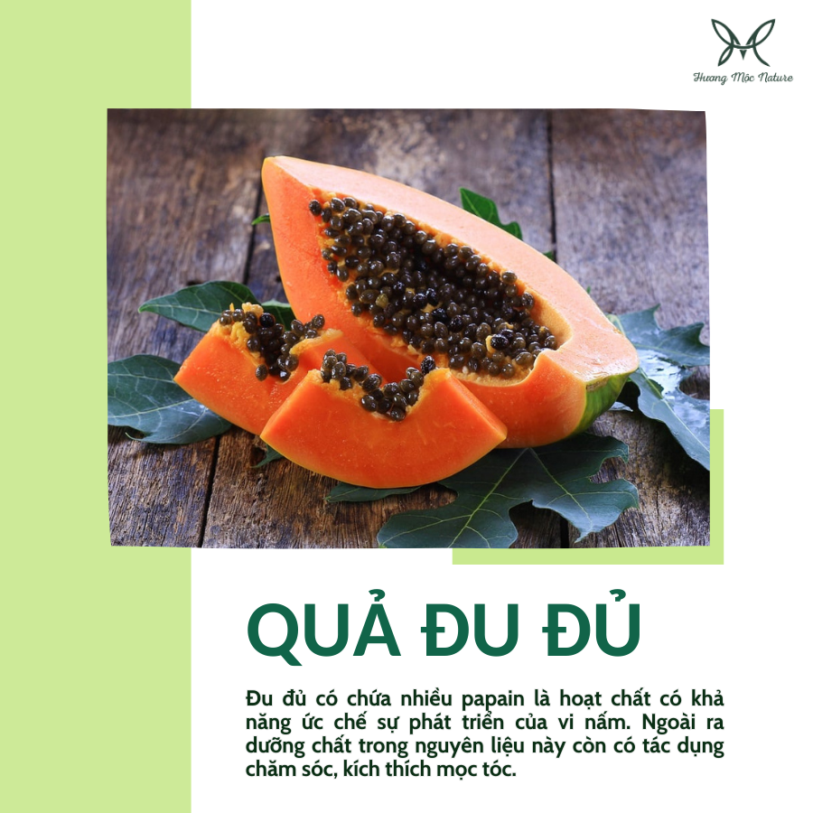 Trong quả đu đủ, chúng ta tìm thấy một thành phần đặc biệt quan trọng là papain, một loại enzyme có khả năng ức chế sự phát triển của vi khuẩn và nấm. Papain là một trong những thành phần quan trọng giúp làm dầu gội trở nên hiệu quả trong việc giải quyết các vấn đề về da đầu, như gàu và nấm ngứa.